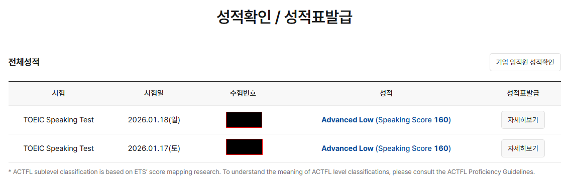2주간의 공부 끝에 토익스피킹 첫시험에서 AL를 취득했다. 토요일 시험은 1월 5일, 일요일 시험은 1월 9일 접수했다. 사실은 부모님, 누님 가족과 2박 3일간 여행을 떠난 기간에는 하루 1시간도 공부하지 못했기 때문에 열흘정도 공부했다고 보는게 맞다. 여행와서 공부한다고 누나한테 핀잔을 듣고 심하게 다툰 건 비밀..